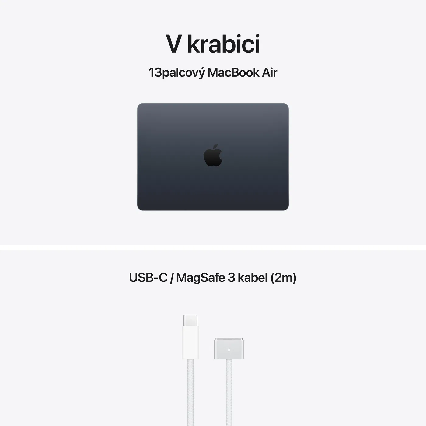 MacBook – Apple M5 (10jádrový), 13,6″ IPS lesklý 2560 × 1664 px, RAM 16GB, Apple M5 8jádrová GPU integrovaná grafická karta, SSD 512GB, podsvícená klávesnice, webkamera, čtečka otisků prstů, WiFi 7, WiFi, Bluetooth, hmotnost 1,23 kg, macOS