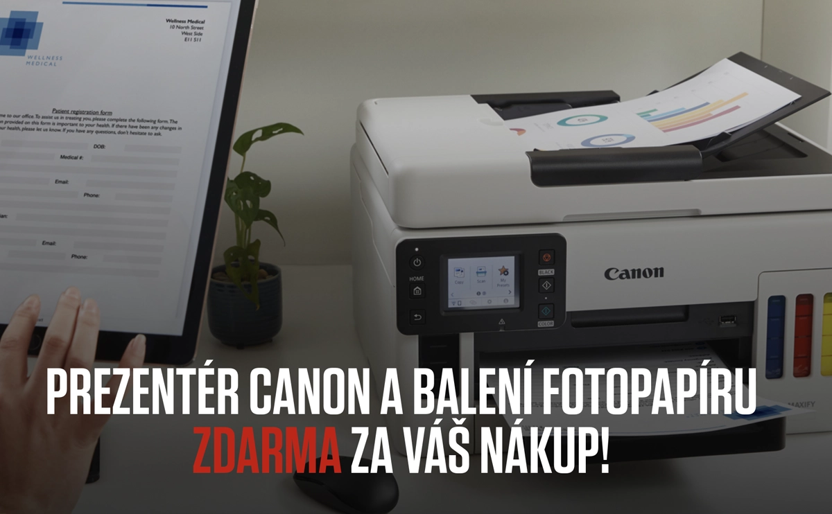 Při koupi jedné z vybraných tiskáren Canon MAXIFY teď získáte prezentér Canon PR500-R v hodnotě 1 390 Kč a navíc fotopapíry zdarma (10 ks A4 + 10 ks 10×15 cm).